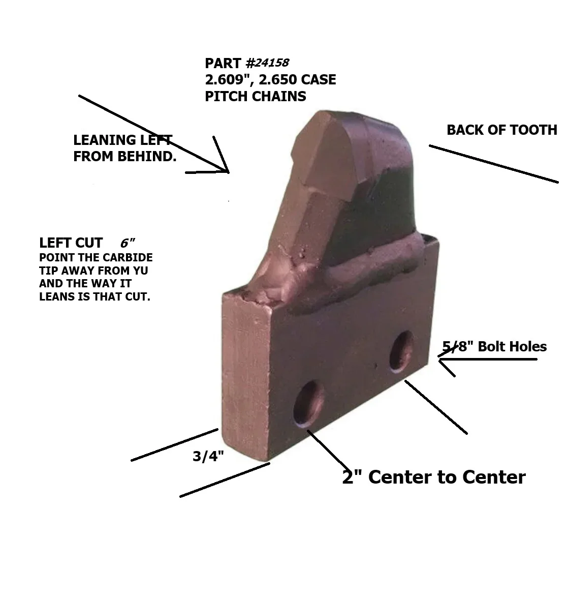 2.609″, 2.650″ Pitch 6″ Cut Left Shark Side Mount, designed for Case ride-on mid-size trenchers with standard and heavy-duty chains featuring 2.609″ and 2.650″ pitch. The bolts are 5/8″ and 2″ center to center. Can bolt inside of and outside of chain. It takes the left and right-side mount to make the 6″ cut.