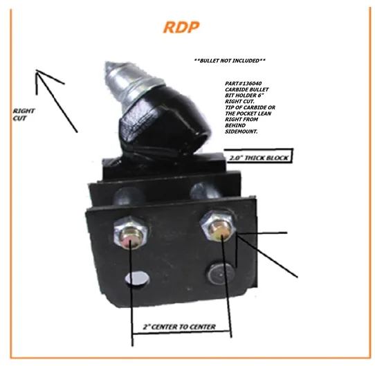 2.0″ Pitch Carbide Conical Rock Bit Adapter (Does Not Come with Carbide Bullet Bits), bolt-on design, cuts to theright-hand side, 6″ wide. Compatible with Ditch Witch, Vermeer, Bobcat, and other ride-on trenchers with a 2.0″ pitch trencher chain. To determine chain pitch, refer to the Home Page under the Chain Section. Replaceable bits with a .765 shank fit these pockets.